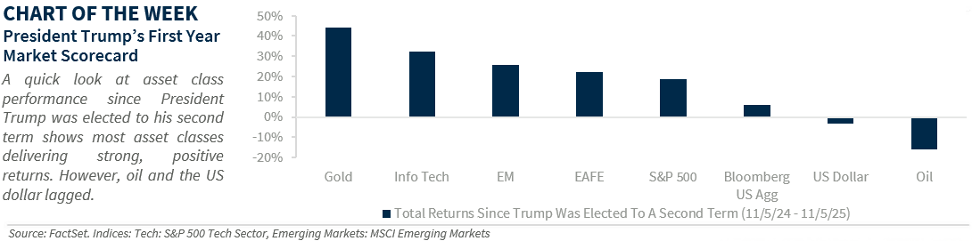 - Trump’s First-Year Scorecard | This week marks one year since President Trump was elected to the White House for a second, non-consecutive term. Despite bouts of volatility—especially after Liberation Day (April 2)—the economy and markets have held up better than many expected amid ongoing trade wars. Growth is on track to reach 1.8% in 2025, and while inflation remains elevated, it’s been milder than anticipated given the steepest tariff hikes in nearly a century. For investors, most major asset classes have extended last year’s gains: the S&P 500 is up +19%, S&P Tech sector +32%, EAFE +22%, MSCI EM +26%, Bloomberg Aggregate Bond Index +6.0.%, and gold is up an impressive 44% since Election Day. Notable laggards include oil, down 17%, and the US dollar, off 3%. These trends echo Trump’s first term—except for gold and oil. The downside: A prolonged government shutdown could add near-term economic risks to an already slowing backdrop—marked by weaker job growth, the highest October layoffs since 2003, and pressured consumer spending. It could also further weigh on his approval rating, which is already at its lowest level this year (+43% in RealClear Politics average).